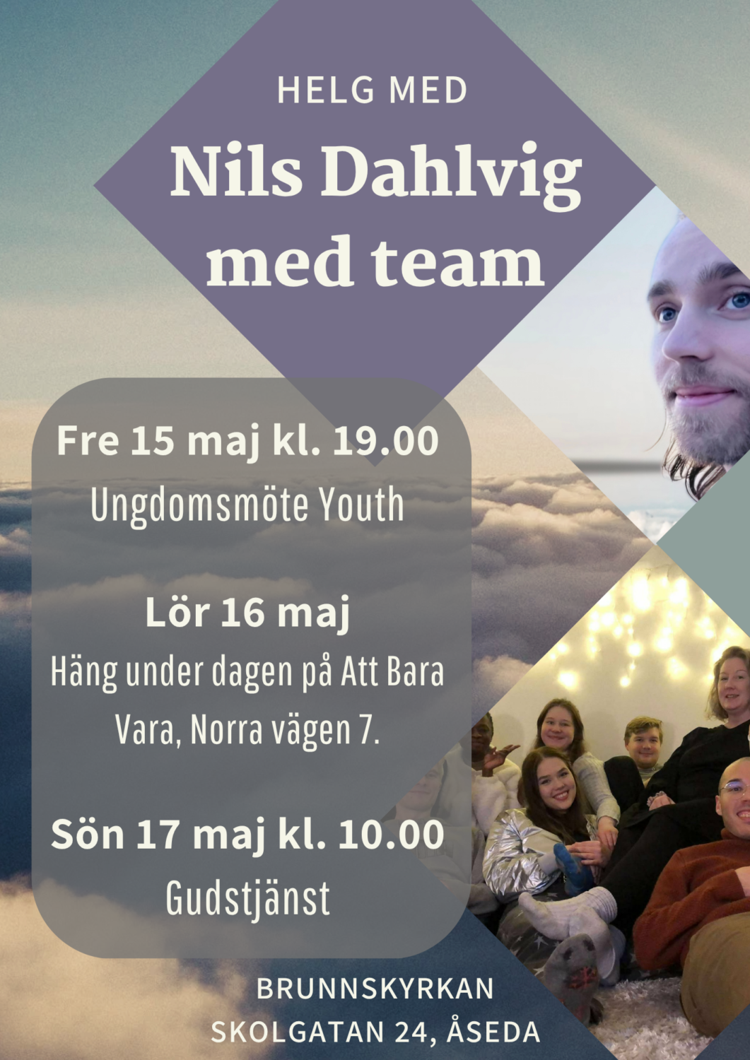 Helgen 13-15 maj gästas vi av Nils Dahlvig, evangelist känd från SVTs dokumentär Jesus i Örkelljunga. Med sig har ett team och de medverkar i ett ungdomsmöte på fredag kväll och på gudstjänst på söndag förmiddag. Under lördagen kommer de att finnas bl a på Att Bara Vara för den som vill komma och lära känna dem lite bättre. Välkomna!